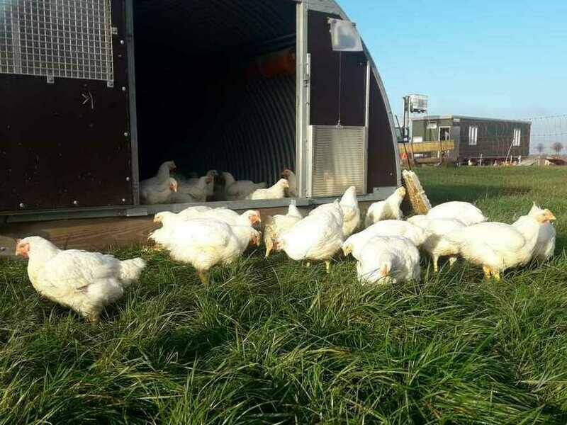 Hähnchen aus Freilandhaltung im Mobilstall.
